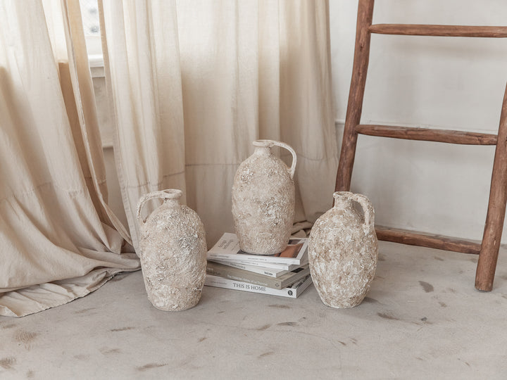 Best styled as decorative pieces. Please refrain from adding water to the vase, as its clay composition is susceptible to damage from moisture.