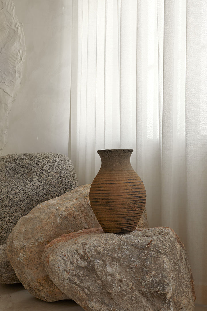 Best styled as decorative pieces. Please refrain from adding water to the vase, as its clay composition is susceptible to damage from moisture.