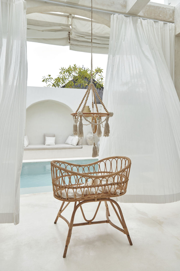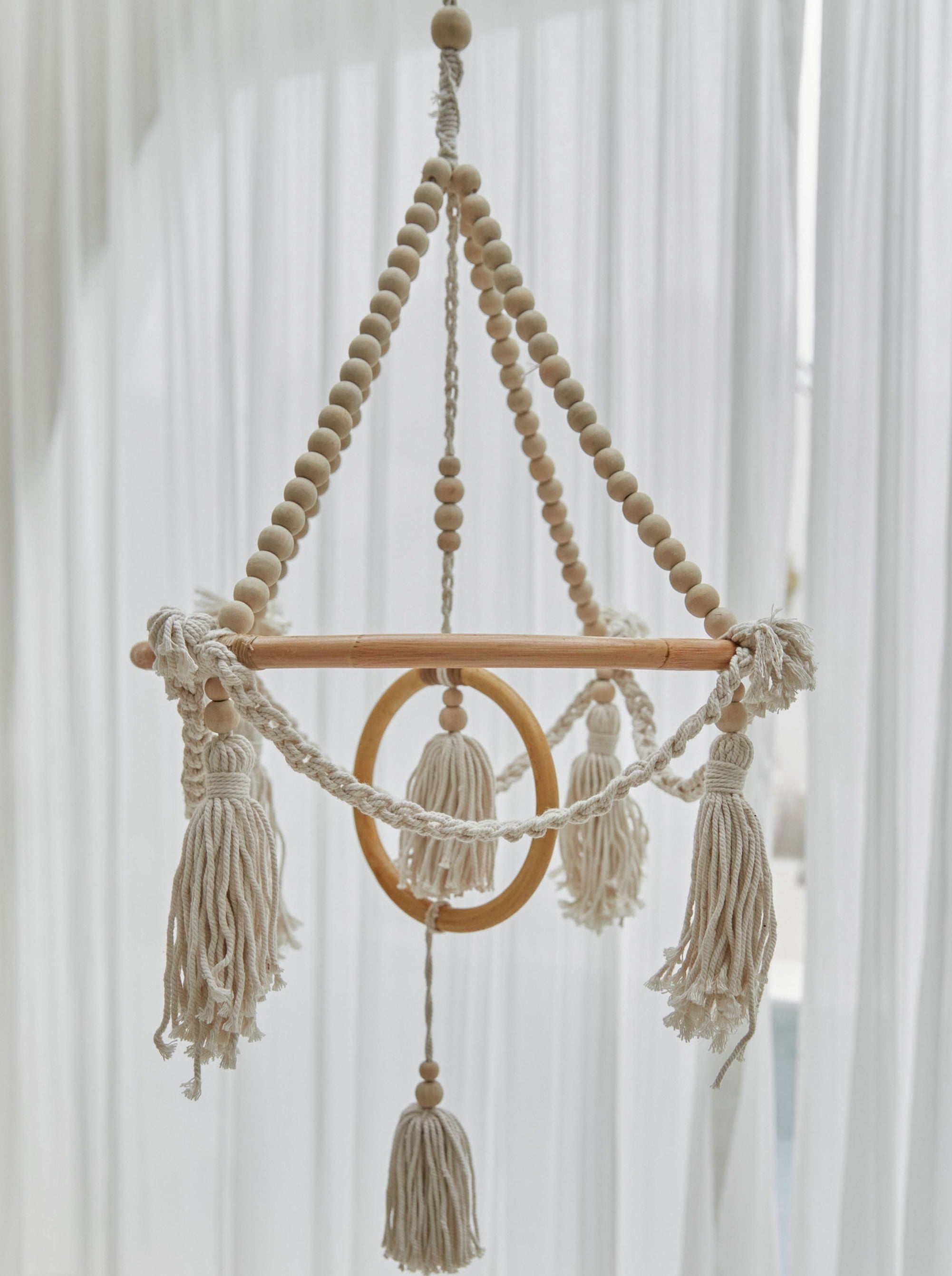 Complete your dream baby nursery with our Bayi Mobile. This whimsical mobile is designed to create a warm and inviting atmosphere with its natural wood finish, delicate beaded strings, and soft tassels. Handcrafted with care from natural materials, our mobile is made to last and easy to install, making it the perfect addition to any nursery.