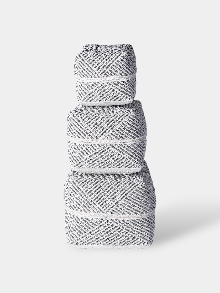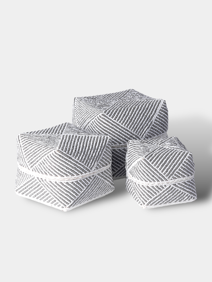 Introducing our gift set of three Gliss Beaded Boxes. Sizes included are the extra small, small and medium boxes. This value deal offers a perfect opportunity to adorn your space with these exquisite handcrafted boxes. Whether used as charming decorative accents resembling gifts or for practical storage in your home, these boxes add a touch of elegance to any setting. Conceal and organize your belongings in style, all while enjoying the convenience of having a set of three boxes in varying sizes. Elevate your decor with this unique and functional ensemble.