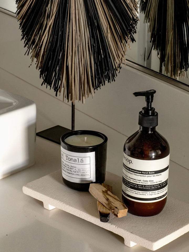 The Ayu Tray is specifically designed to be the perfect companion for your bathroom vanity. Its sleek and minimalist design blends seamlessly with any bathroom decor, adding a touch of sophistication to your space. The sandstone material offers a smooth and luxurious texture, creating a visually appealing focal point in your bathroom.