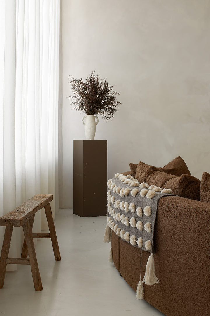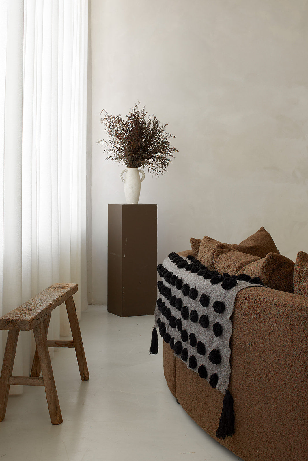 The Ula Wool Throw is artfully handcrafted in Chiapas, Mexico, utilizing 100% natural, unprocessed wool sourced from regionally-raised sheep. The wool undergoes a traditional spinning and weaving process on a loom, resulting in a richly textured fabric that is further enhanced with charming pom poms and elegantly finished with a tassel at each corner. Available in a selection of black, grey, and cream, these artisanal throws provide an elegant decorative element, perfect for complementing your bed or sofa.